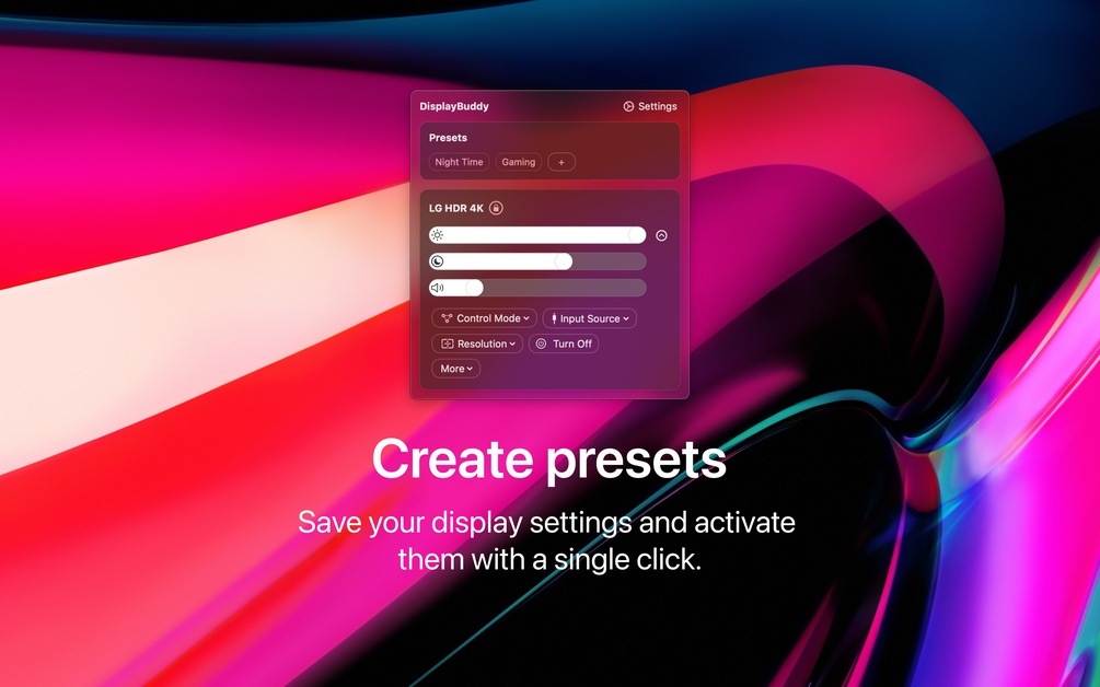 DisplayBuddy lets you control external displays connected to your Mac right from your menu bar! No need to touch your clunky monitor buttons!